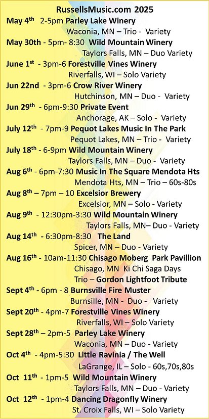 "Russell & his band have performed here for over 5 years. We book him as often as we can." Steve Z, Parley Lake Winery